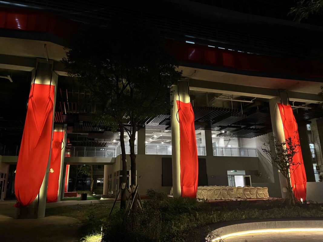 結構懸掛挑戰: 「理工之柱」巨大的圓柱體缺乏傳統吊掛支撐點。面對超大、超長的紅布幔,如何在高空精準固定並確保揭牌瞬間的流暢感,成為團隊最大的考驗。